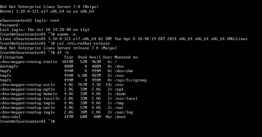 Linux eSuareznotes01 3.10.0-123.el7.x86_64 #1 SMP Mon May 5 11:16:57 EDT 2014 x86_64 x86_64 x86_64 GNU/Linux